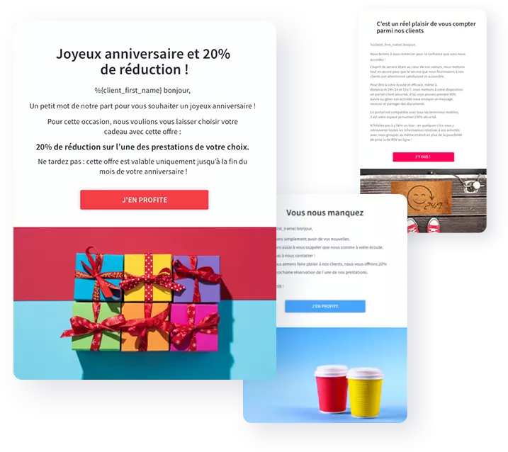 La fonctionnalité vous permet d’accéder à 3 campagnes accrocheuses élaborées par notre équipe marketing dans le but d’engager et fidéliser vos clients : Un mail de « bienvenue » pour les nouveaux clients, un mail Joyeux Anniversaire et un mail pour les clients inactifs. Conciliez efficience et séduction !